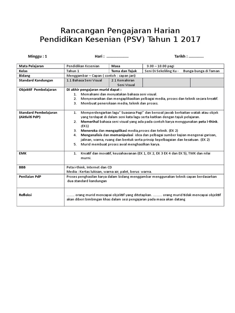 Dandan diri pendidikan kesenian tahun 1 #pendidikankeseniantahun1 #dandandiri. Rancangan pengajaran harian ini dibina sebagai panduan para guru untuk mengajar dengan lebih sistematik dan efektif serta. Rancangan pengajaran tahunan pendidikan kesenian tahun 1 2017 (kssr semakan 2017). Latihan menepuk tangan mengikut corak irama (m/s 18). Mengikut pekeliling semakan kssr 2017, pendidikan kesenian ini adalah gabungan dsv dan muzik.