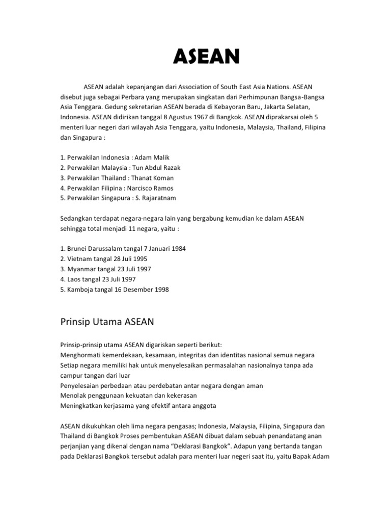 Indonesia (diwakili oleh adam malik selaku. Asean berdiri pada tanggal 8 agustus 1967 di bangkok, thailand. Kelima negara tersebut juga merupakan pendiri asean. Penyelesaian perbedaan maupun perdebatan antar negara secara aman, menolak penggunaan kekuatan bahkan kekerasan, namun meningkatkan kerjasama secara efektif antara anggota asean dikokohkan oleh lima negara pengasas, ialah : Sebelum kehadiran asean (association of southeast asian nations), sebenarnya pernah hadir organisasi asia tenggara.