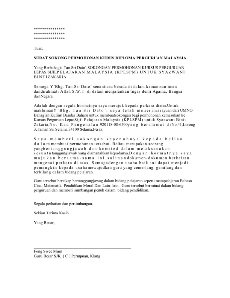Related : Surat Sokongan In English / Tuan/puan, sokongan permohonan mengikuti ijazah sarjana muda kejuruteraan (mekanikal)..